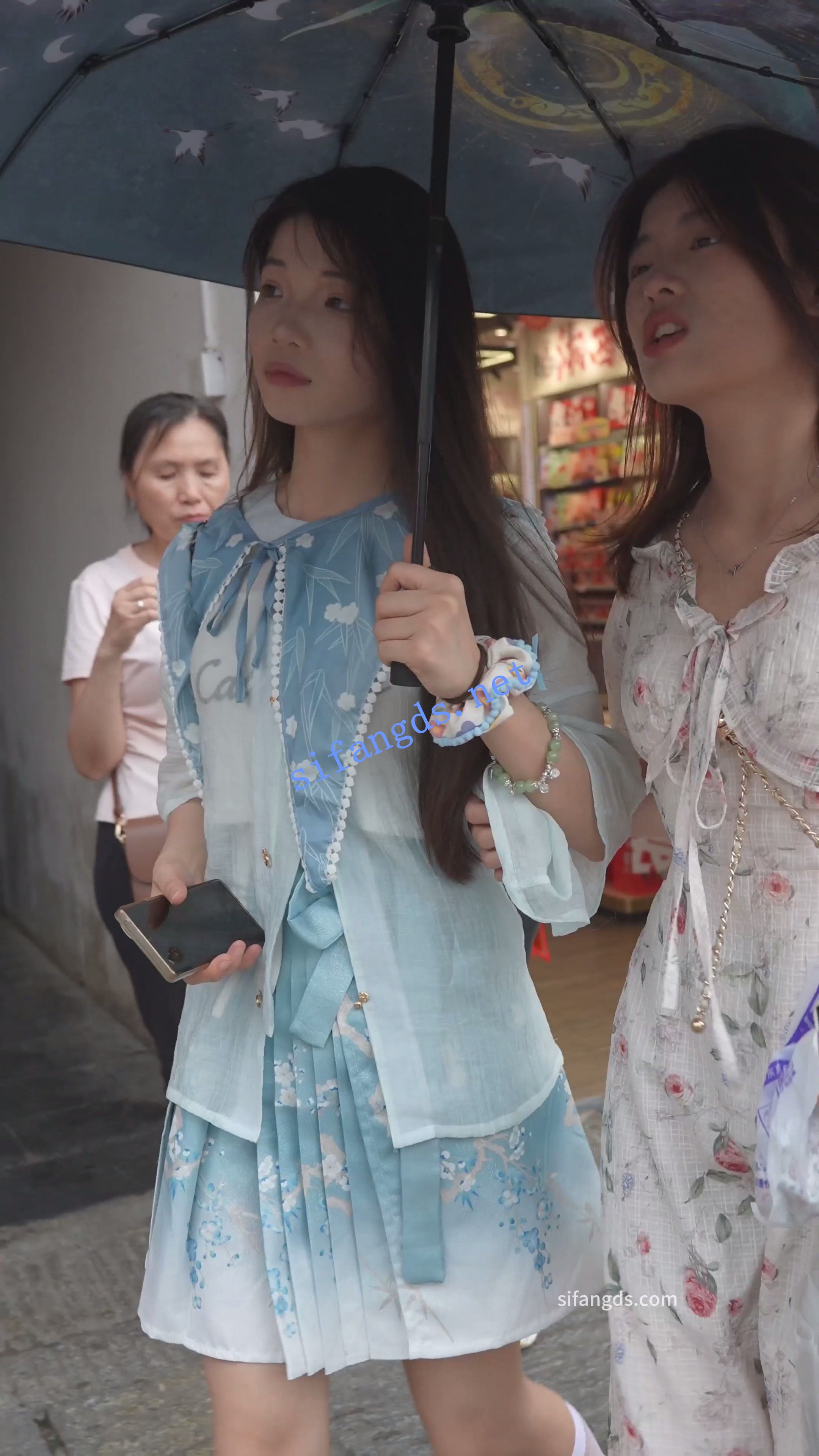 清纯汉服小姐姐逛街,浅蓝内中间湿了一块。